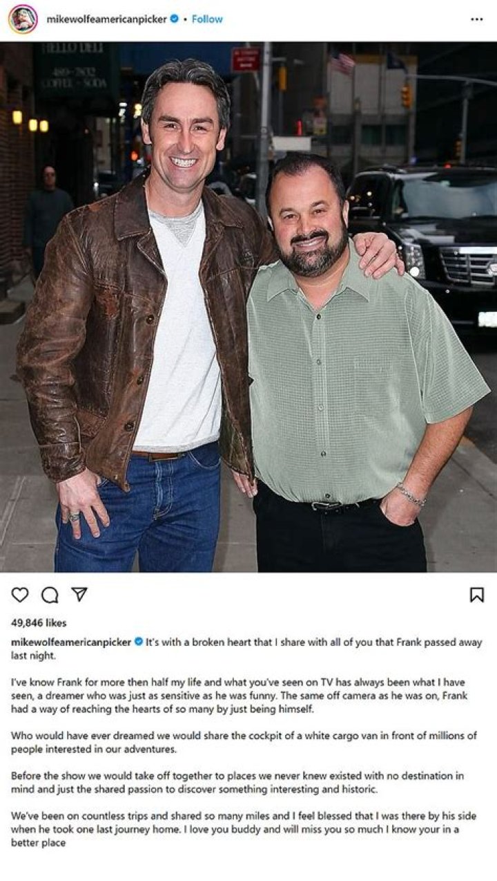 Frank Fritz, best known for his role in the History Channel series "American Pickers," died on July 19, 2022, at the age of 59. His death was confirmed by his former co-star Mike Wolfe, who posted a statement on Instagram saying, "My heart is broken today as I lost a friend and a brother. I learned a lot about friendship and brotherhood over the years and will miss him a lot. He has been like a brother to me, and I will miss him a lot."