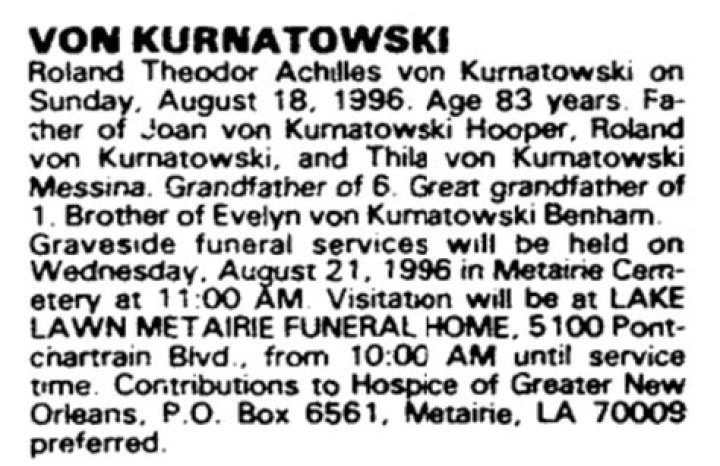Roland von Kurnatowski Sr. passed on 18 August 1996 in the United States of America. He died at the age of 83 years.